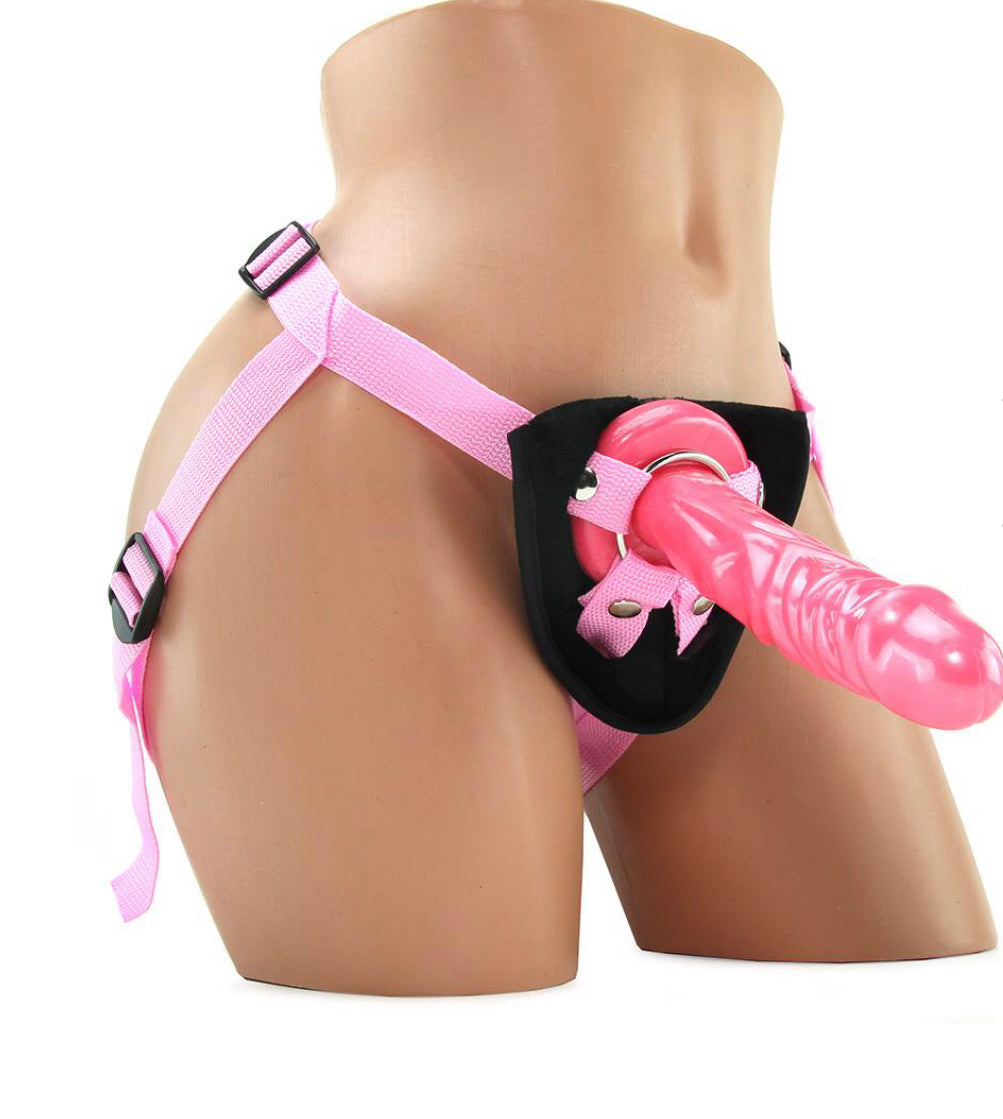 Arriving almost fully assembled, the harness itself slips quickly over waist and thighs, tightening to fit with just a tug on extra long straps. Before stepping in, attach the lifelike pink dildo by sliding it through the O-ring with flat base facing the body. Just about any similarly sized flange-based penetrator can be used instead, provided it will fit through the 1.75 inches (4.4) of ring diameter.